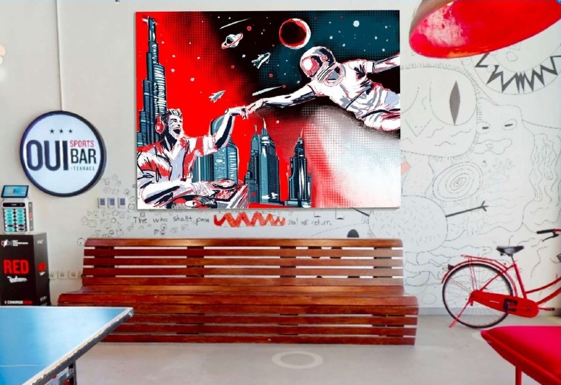 Roy’s commissioned work for the hotel, titled “Urban Pulse: Collective Energy,” is a visual embodiment of the brand’s mission to fuse art, fashion, and music in an urban, flexible, and emotionally charged space. The piece captures the hotel’s rhythm – one driven by technology, diversity, and global connectivity – and invites guests into a narrative that extends beyond the frame. It’s not just art for art’s sake. The work is meant to provoke reflection, interaction, and in true RED style to make a statement. The piece includes disruptive visual elements and angles that demand engagement, both on-site and online.
