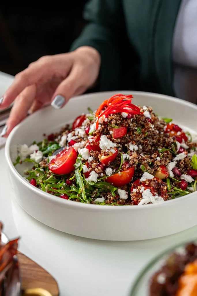 Salads, particularly the quinoa salad and the signature Pastilla Salad,