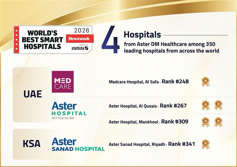 - تم اختيار مستشفى أستر المنخول، ومستشفى أستر القصيص، ومستشفى ميدكير الصفا في دولة الإمارات العربية المتحدة ضمن قائمة “أفضل المستشفيات الذكية في العالم لعام 2026” بحسب تصنيف مجلة نيوزويك، من بين 350 مستشفى عالمياً.