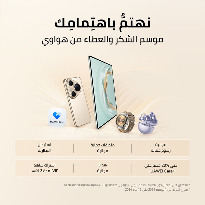 الإمارات العربية المتحدة، 23 نوفمبر 2025 – مع استعداد دولة الإمارات لاستقبال موسم الأعياد وبداية عام جديد مليء بالأمل والتآلف، تُعبّر هواوي مجددًا عن تقديرها العميق لعملائها من خلال إطلاق موسم العطاء من خدمات هواوي 2025، الذي يستمر حتى 15 يناير 2026. تحتفي هذه الحملة بروح العطاء والامتنان والتواصل الإنساني، وتمنح المستخدمين فرصة للبدء بعام جديد بطمأنينة وراحة بال مع أجهزة تعمل بكفاءة عالية.