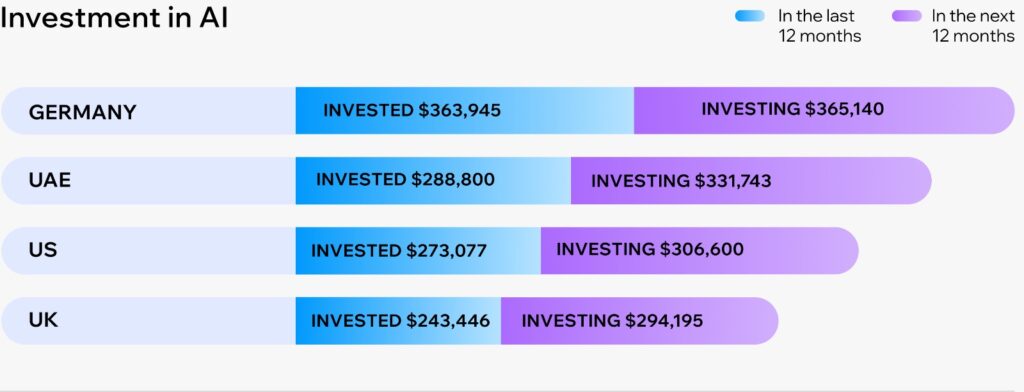 يتسارع معدل الاستثمار في الذكاء الاصطناعي جنبًا إلى جنب مع تبنيه؛ إذ خلال العام الماضي، استثمرت شركات التجارة الإلكترونية متوسط 291,626 دولارًا أمريكيًا في الذكاء الاصطناعي، ومن المتوقع أن يرتفع هذا الرقم بنسبة 11% ليصل إلى 323,886 دولارًا أمريكيًا في عام 2026، مع إعطاء العلامات التجارية الأولوية لخدمة العملاء المدعومة بالذكاء الاصطناعي، والإعلانات المخصصة، والاكتشاف الذكي للمنتجات.
