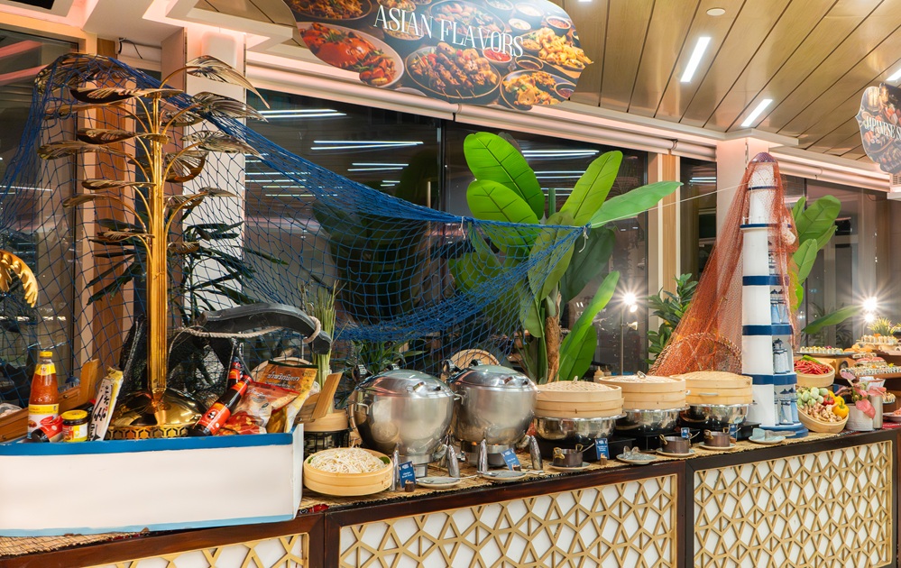 في الركن الآسيوي، تتلألأ أطباق السوشي الفاخر بتناسق بصري ومذاق عالمي.