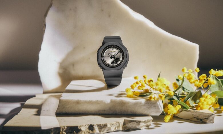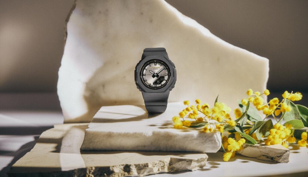 واستناداً إلى التصميم المدمج لسلسلة GMA-P2110 وإطارها المثمّن المميز، تأتي ساعة GMA-P2126W بلمسة جمالية متناغمة باللون الرمادي الداكن، تُبرز عمق وتعدد استخدامات لوحة الألوان الأحادية. وتضفي اللمسات الذهبية الدقيقة تبايناً أنيقاً يعزز الإحساس بالدفء والرقي الهادئ، فيما يسهم استخدام العناصر المعدنية على المينا في إضفاء طابع نهائي أكثر فخامة ودقة على التصميم العام.
